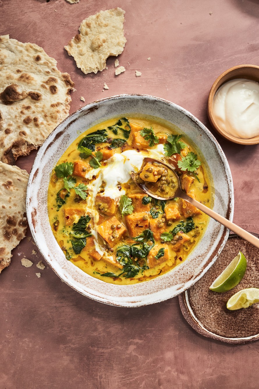 Bataatista ja linsseistä porisee kauden odotetuin pata. Raikkaan pehmeästä mausta on kiittäminen kookoksen ja limetin yhdistelmää.