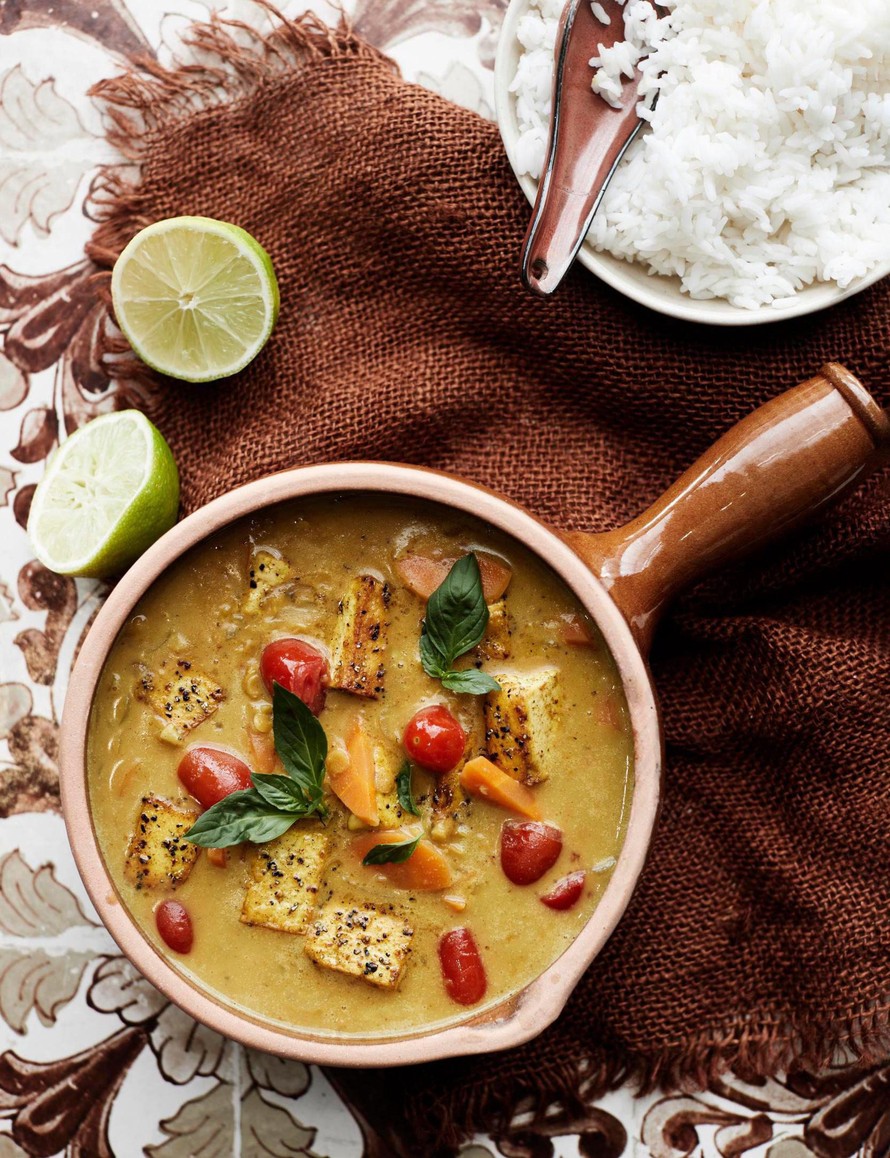 - Lisää linssikastikkeen joukkoon porkkanat ja tomaatit. Hauduta kastiketta 5 minuuttia. Lisää tofut ja jatka kypsennystä muutama minuutti. Jos kastike on liian sakeaa, voit lisätä vettä. Silppua pinnalle thaibasilikaa.
