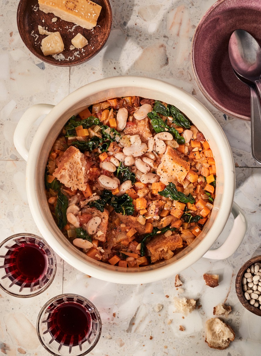 Ribollitaan voi käyttää niitä kasviksia mitä kaapista löytyy. Lisää vettä, jos haluat padasta keittomaisempaa.