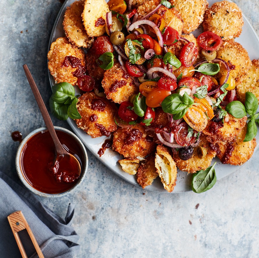 Tarjoile rapsakat pastat tomaattisalaatin ja kastikkeen kanssa.