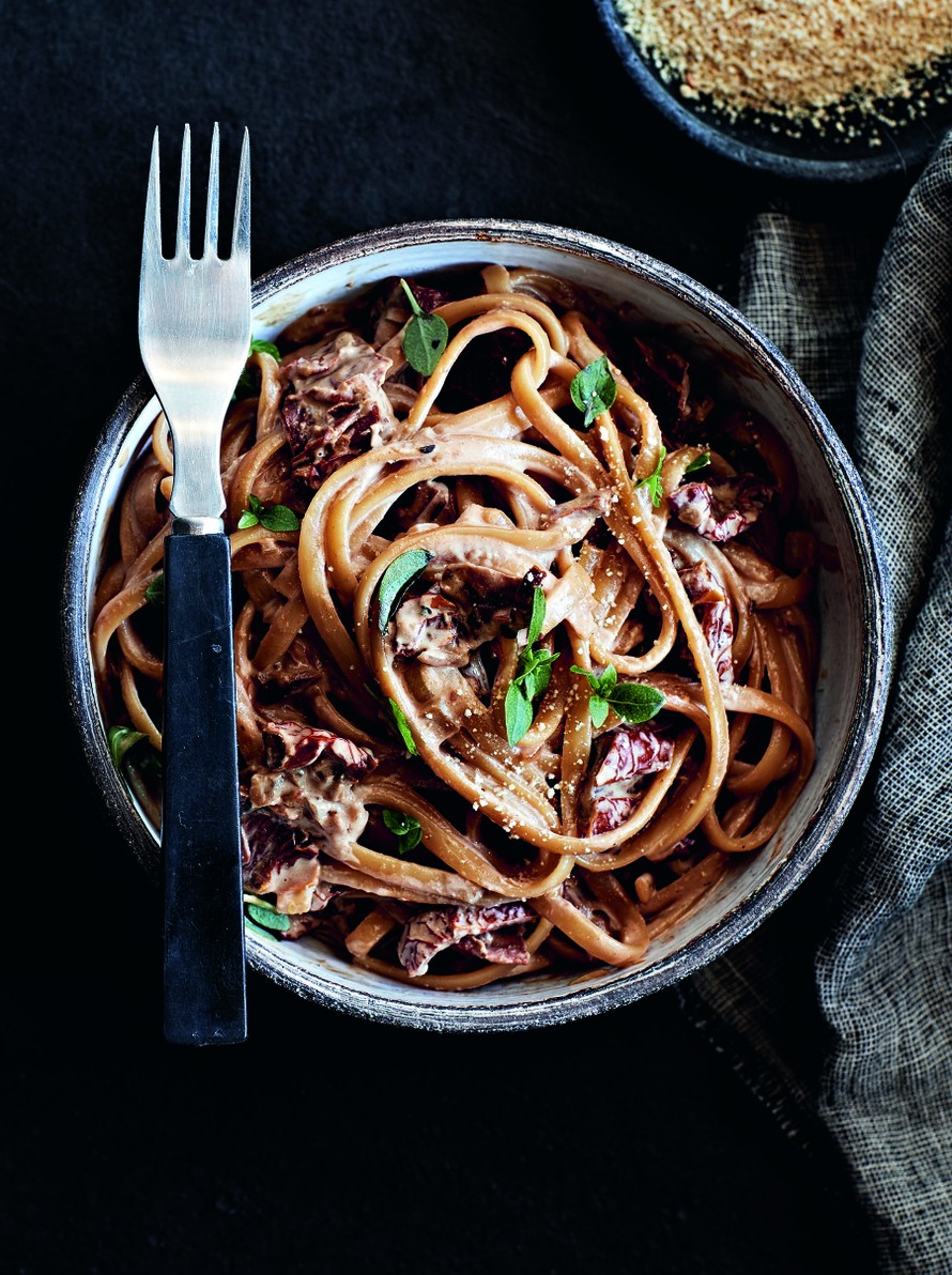 Vinkki Tee pastan pariksi vegaanista ”parmesaania”. Paahda 200 g cashewpähkinöitä 200-asteisessa uunissa 7 minuuttia. Jauha pähkinät ja 1 dl ravintohiivahiutaleita monitoimikoneessa ja mausta suolalla.