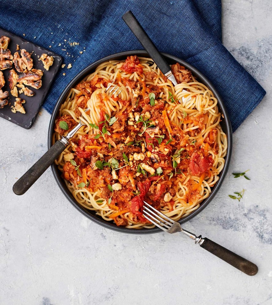 Supermaukas vegebolognese haudutetaan juureksista ja härkiksestä. Parmesaanin sijaan annos viimeistellään paahdetuilla, rouhituilla pähkinöillä.