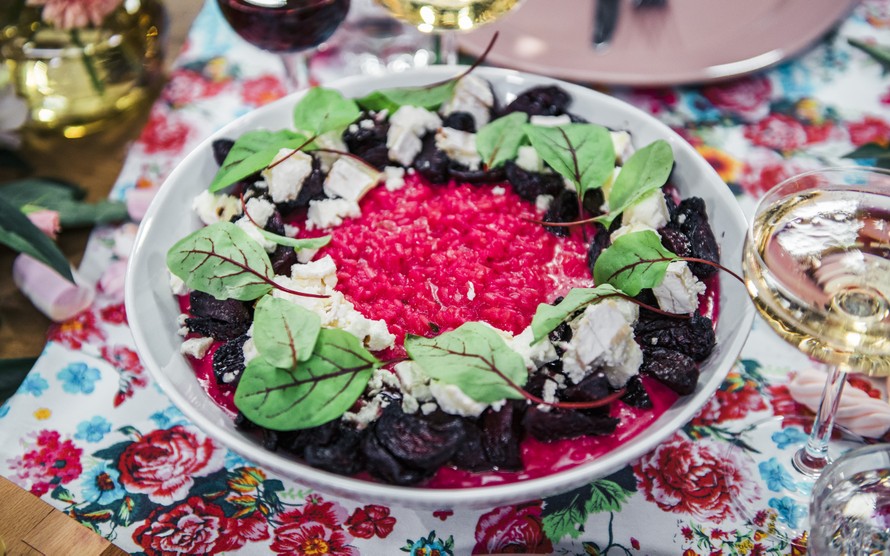 Mieluummin överit kuin vajarit! Ellinooran päivänä Satulinnassa herkutellaan vaaleanpunaisella ruualla. Hehkuvan pinkki punajuuririsotto on herkullista paahdettujen punajuurten ja vuohenjuuston kanssa.