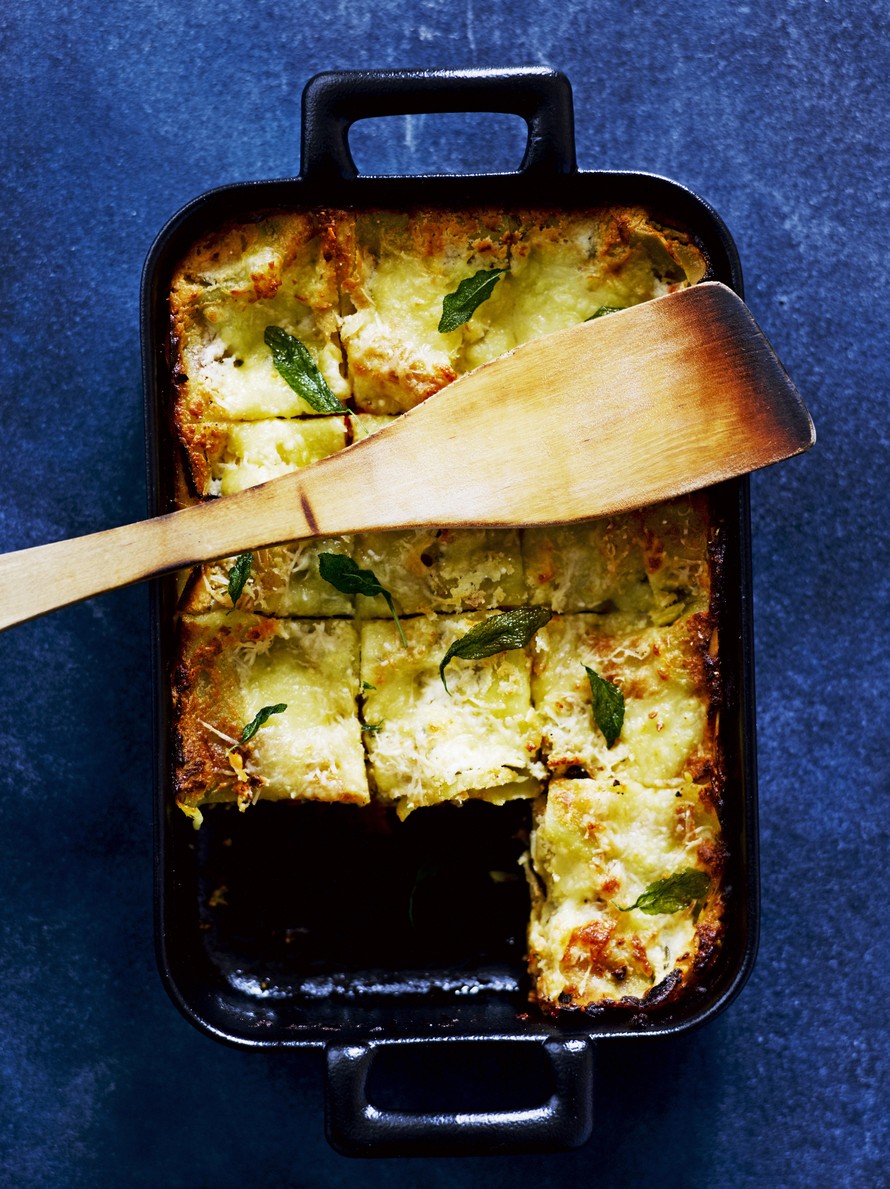 Lasagnen valkokastike korvataan tässä reseptissä sitruunalla ja basilikalla maustetulla rahkalla. Rahka mehevöittää lasagnen mutta tuo ruokaan myös proteiinia.