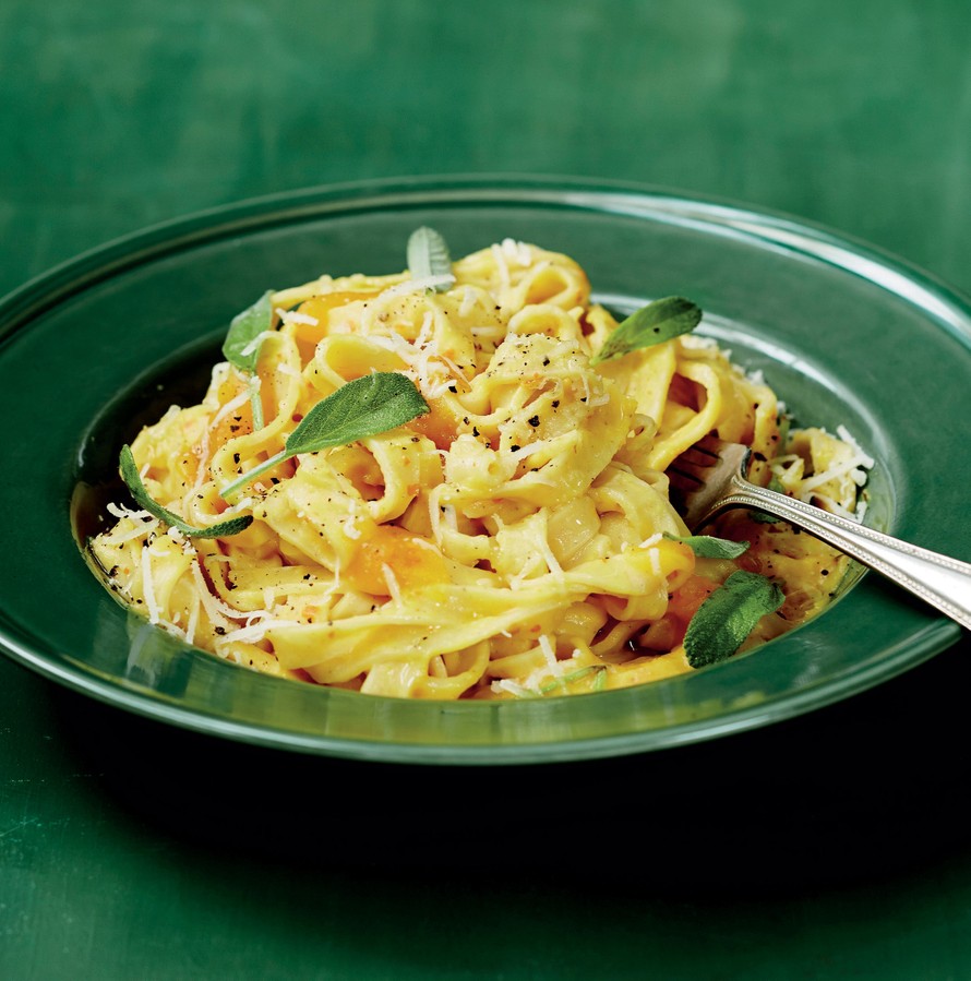 Kurpitsan makeus sopii loistavasti pastakastikkeeseen. Soseen ansiosta et tarvitse kermaa kuin tilkkasen.