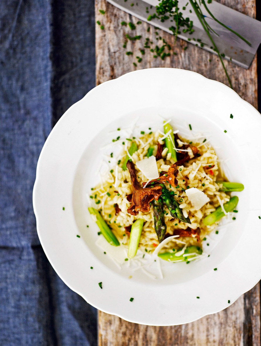 - Kun risotto on valmista, lisää vielä noin 1 dl lientä, sillä risotto saa olla hyvin löysää. Lopuksi lisää raastettu parmesaani, keitetyt parsat ja yrtit. Mausta makusi mukaan. Höylää päälle muutama siivu parmesaania ja viimeistele annos tuoreella kirvelillä. Tarjoa heti.