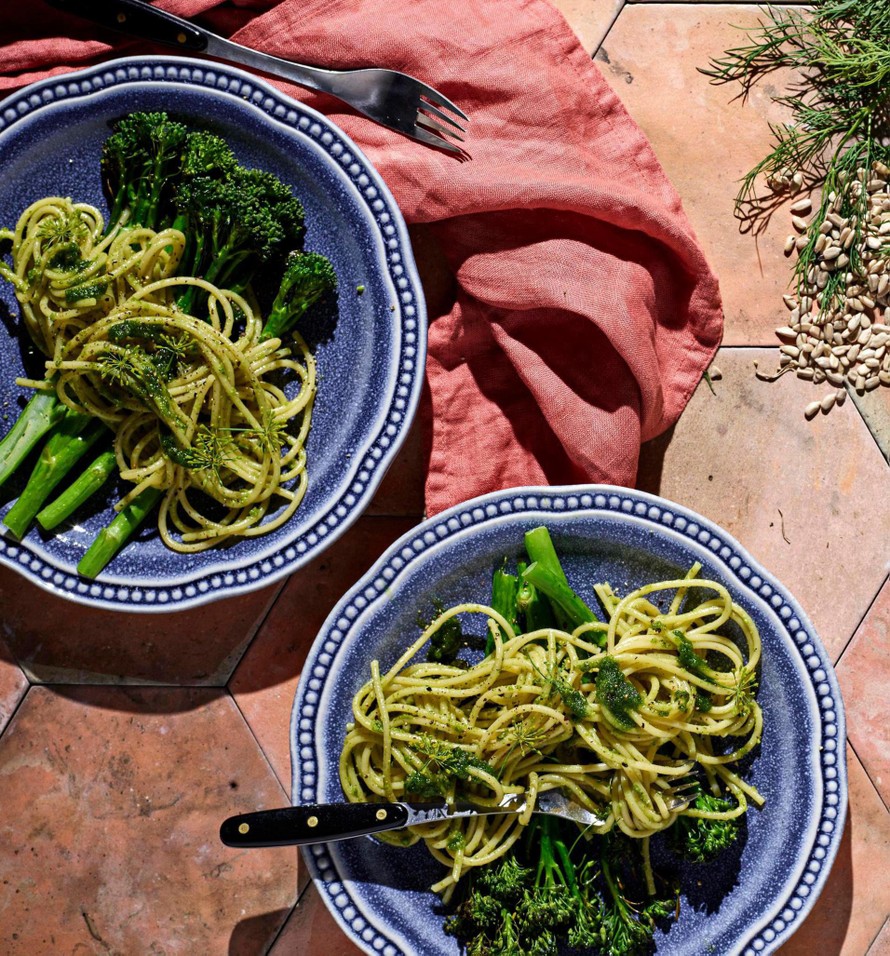 Keitä pasta kypsäksi ripauksella suolaa maustetussa vedessä. Valuta huolellisesti ja kääntele pesto pastan joukkoon. Tarjoa paahdetun broccoliinin kanssa.