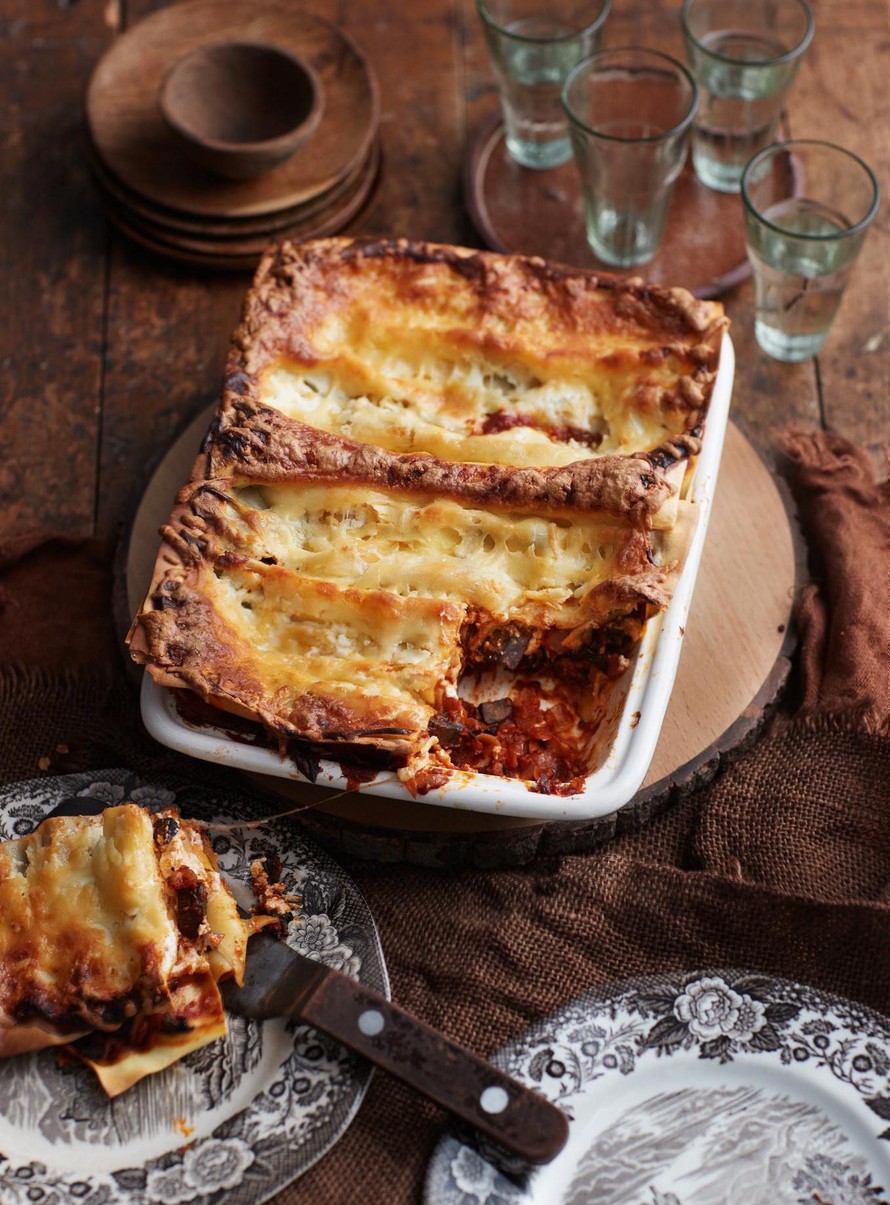 Kypsennä lasagnea 180-asteisessa uunissa 20 minuuttia, niin että pinta ruskistuu. Anna vetäytyä 10 minuuttia ennen tarjoilua.