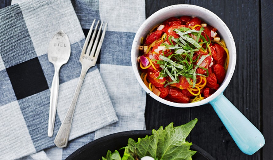 Pastan rakastaja korvaa basilikan japanilaisella tuoksuvalla shisolla. Simppeli pasta tehdään kirsikkatomaateista.