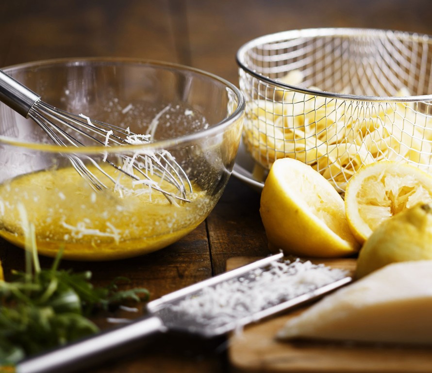 - Raasta parmesaanijuusto hienoksi. Yhdistä kulhossa sitruunamehu, -kuori ja parmesaani. Vispaa joukkoon oliiviöljy ohuena nauhana.