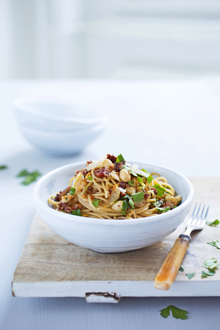 - Annostele pasta lautasille ja jaa kastike annosten päälle. Silppua pinnalle lehtipersiljaa ja parmesaania.