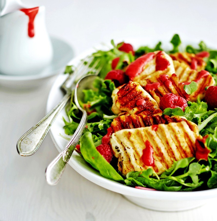 - Grillaa tai paista paistinpannussa halloumiviipaleita noin 1 minuutti molemmilta puolilta tai kunnes ne saavat väriä. Nosta palat salaattipedille ja valuta pinnalle vadelmavinegrettiä.