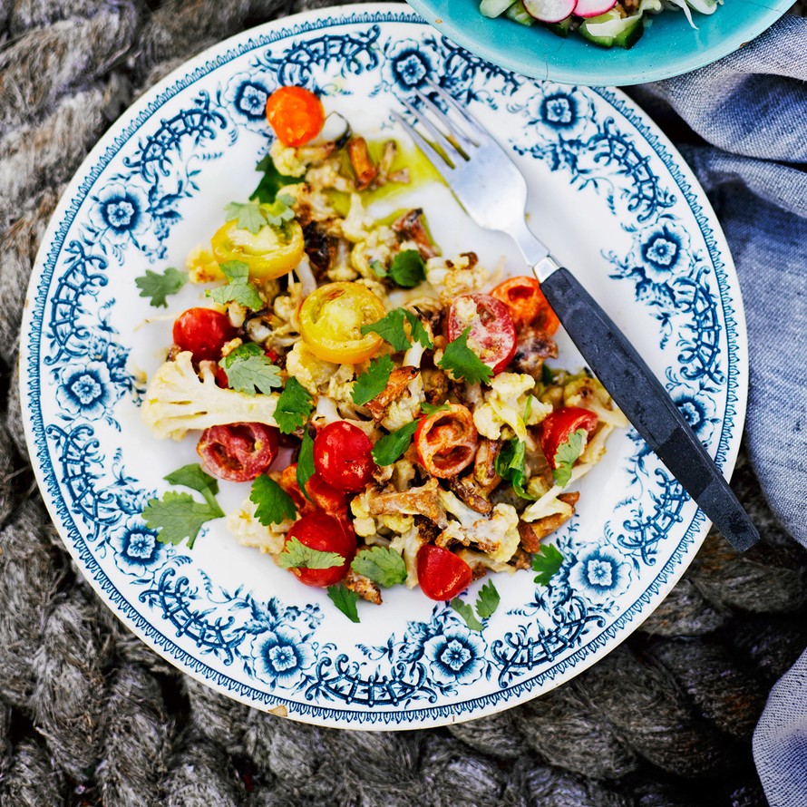 Uppopaista kukkakaalinnuput öljyssä rapeiksi, sekoita makeiden tomaattien ja tuoreen korianterin kanssa ja pyörittele tahinitahnasta tehdyssä seesamikastikkeessa.