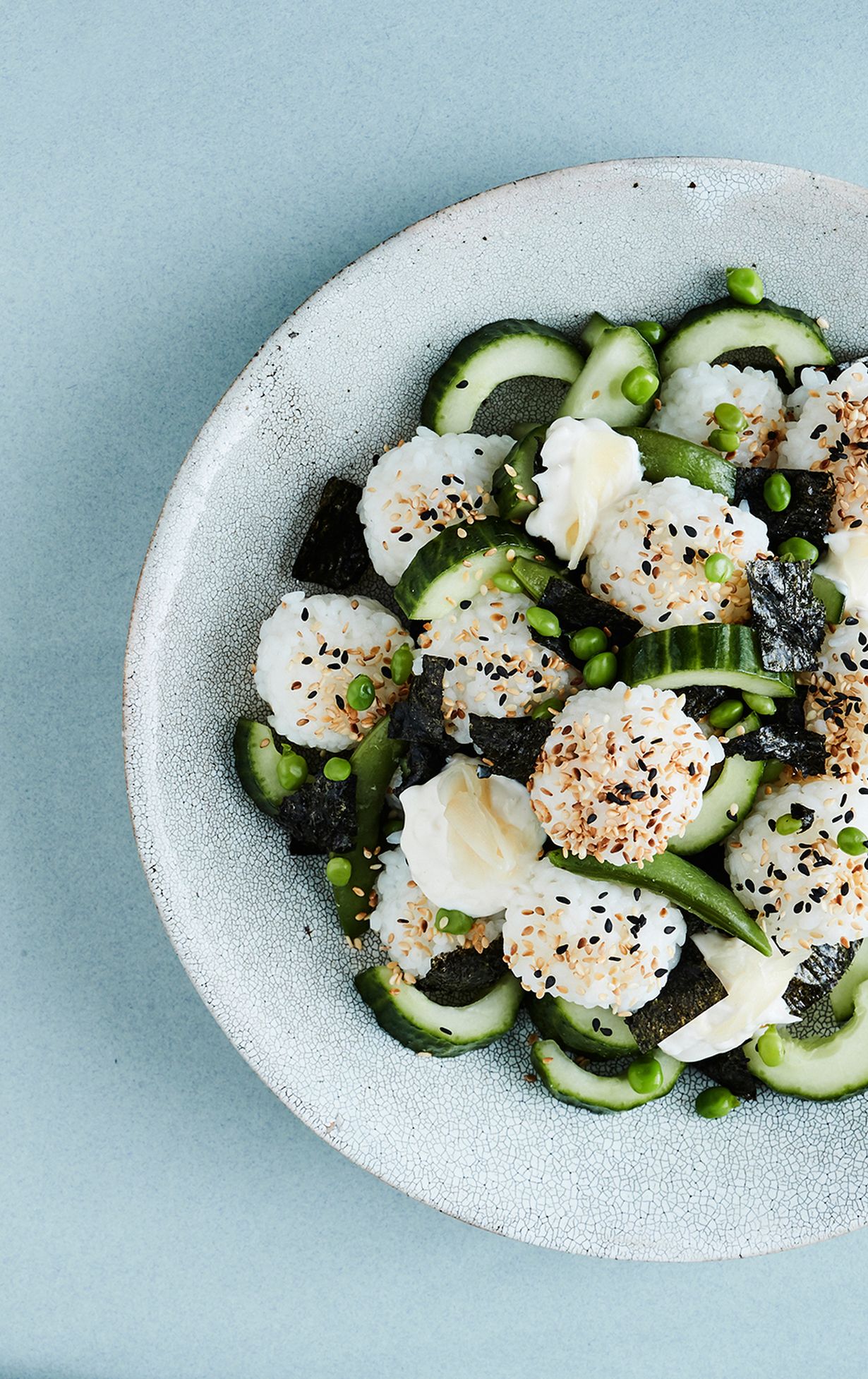- Kokoa salaatti kerroksittain kulhoon ja pirskottele päälle loppu mausteliemi. Tarjoa garimajoneesin ja wasabin kanssa.