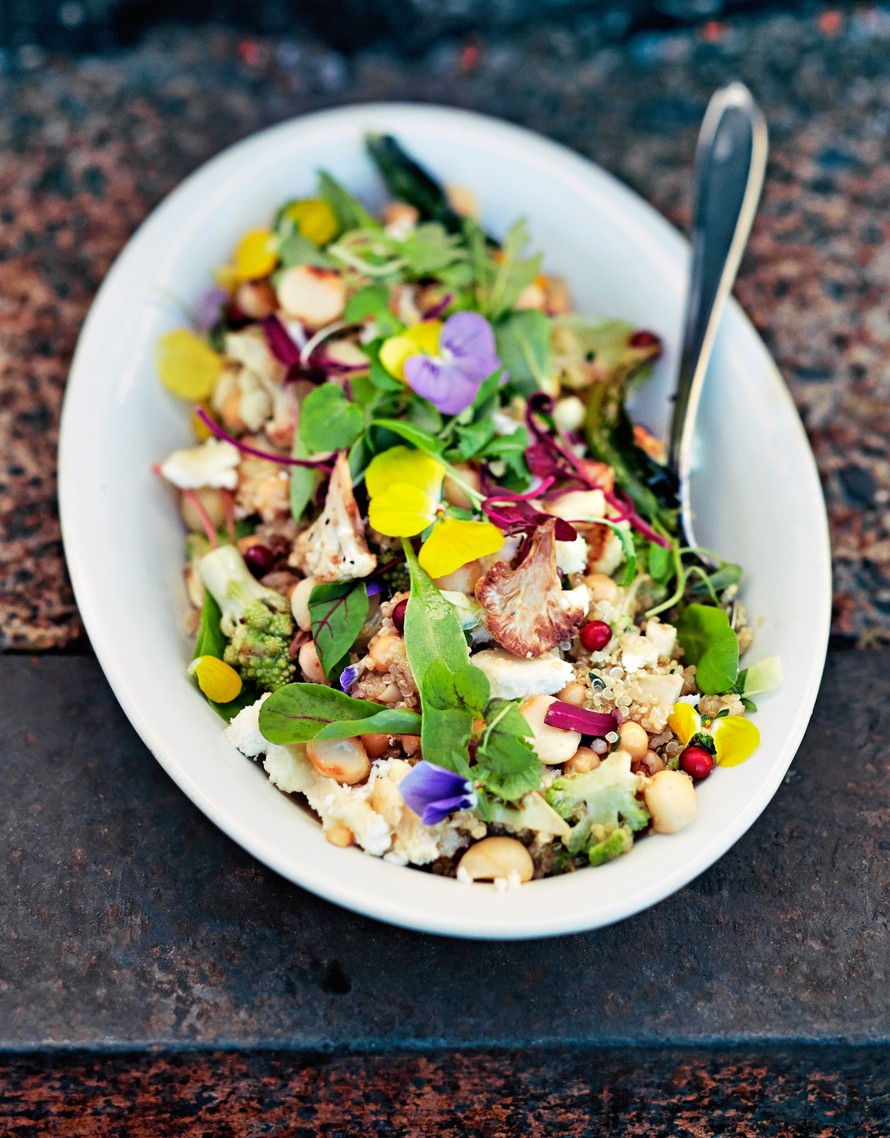 Vegesalaatti on yltäkylläisyyden ylistys: paahdettua kukkakaalia, kvinoaa, kikherneitä, macadamiapähkinöitä ja luomuversoja. Päälle vielä vuohenjuustoa kunnon muruina ja hiukan marjoja.