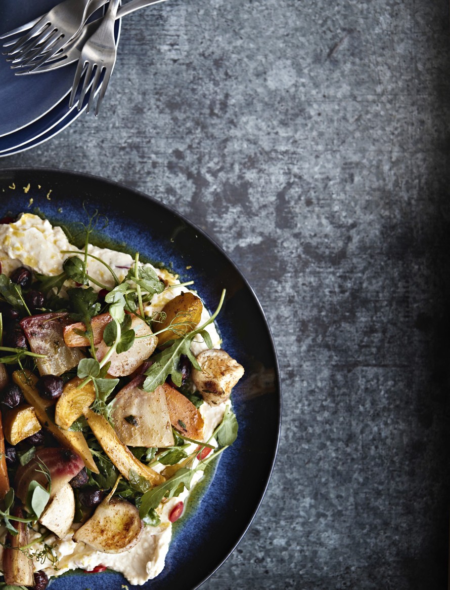 Paahdettuja juureksia, pähkinää ja vatkattu fetakastike