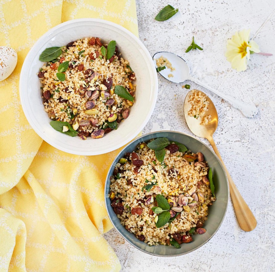 Bulgursalaatti on ihanan ruokaisa mutta kepeä lisuke pääsiäispöytään. Tässä versiossa maistuvat pistaasit, rusinat ja minttu.