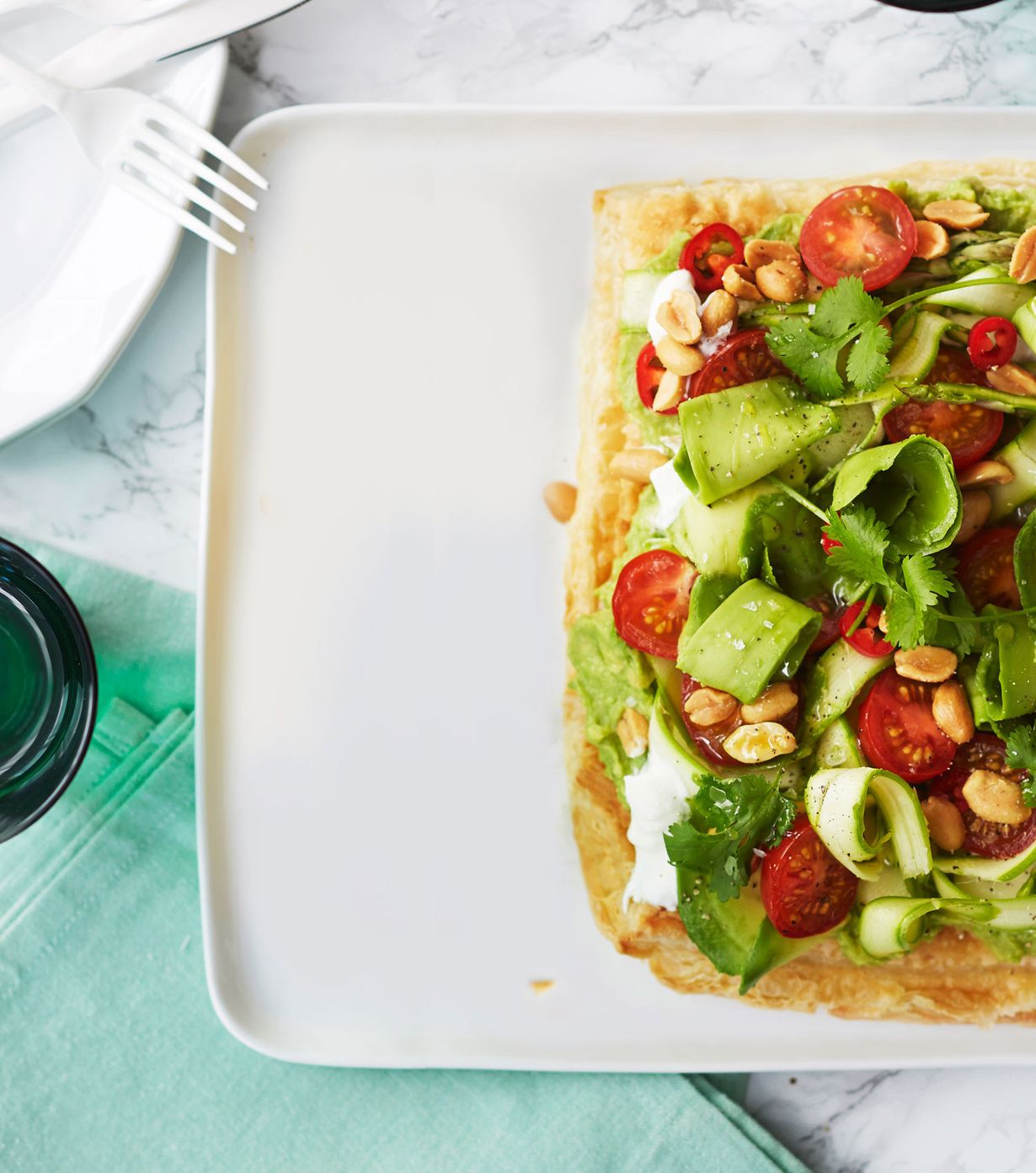- Asettele piiraan päälle parsaa, avokadoa, tomaatteja, korianterin lehtiä, suolapähkinöitä sekä chilirenkaita. Viimeistele öljyllä, sormisuolalla ja mustapippurilla.