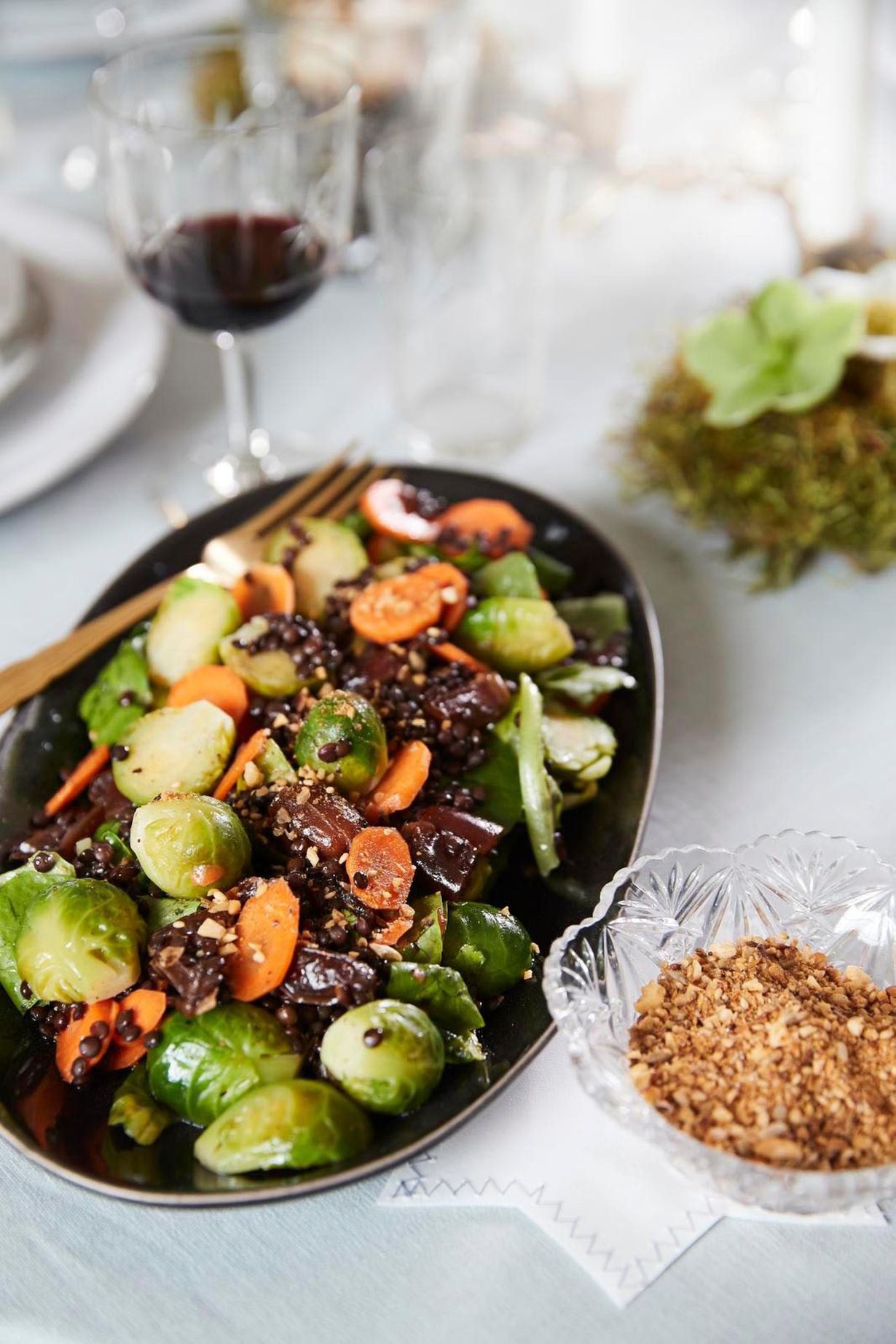Etsitkö salaattia talven juhliin? Tässä se on, lämmin ruusukaali-linssisalaatti, jossa maistuvat taatelit ja ihana dukkah.