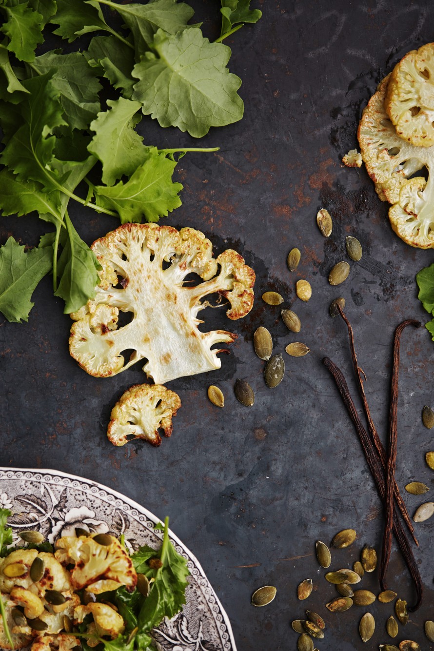 Kukkakaalin ja vaniljan liitto on täydellinen. Paahdetut kukkakaalit kootaan salaatiksi, joka maustetaan öljy-vaniljakastikeella.