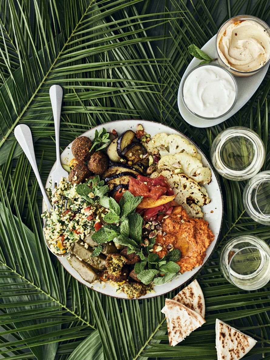Tarjoa viinilehtikääryleet, falafelit, muhammara ja meheviksi paahdetut kasvikset salaatin muodossa! Tämä meze-salaatti sopii ruokailjioiden määrästä riippuen niin alku- kuin pääruoaksi.