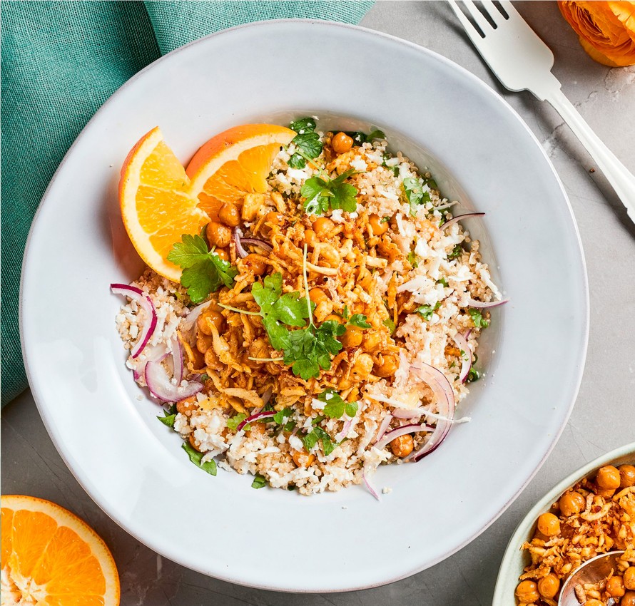 Tofu-kikherneseoksen kypsyessä pese raastinrauta ja raasta kukkakaali karkeimmalla terällä. Leikkaa punasipuli ohuiksi viipaleiksi. Hienonna lehtipersilja. Yhdistä kvinoa, kukkakaali, punasipuli ja lehtipersilja.