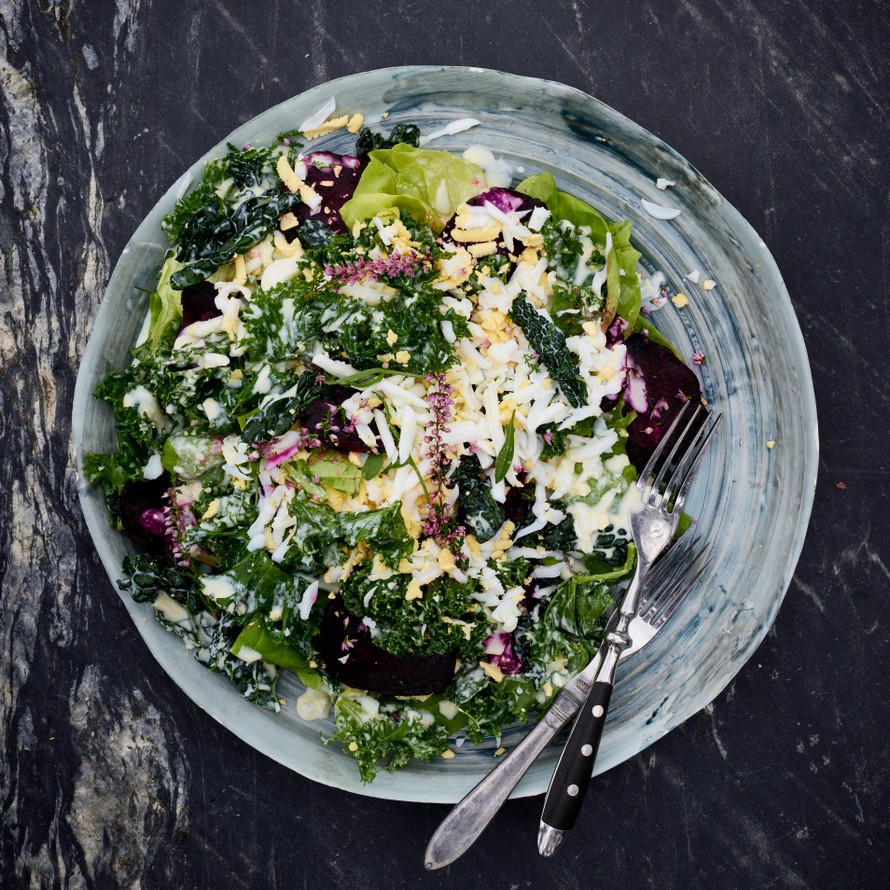 Huuhtele ja kuivaa salaatit. Revi lehdet suupaloiksi isoon kulhoon. Lisää 3 rkl kastiketta ja sekoita. Levitä salaatti tarjoiluvadille, pilko punajuuret salaatille ja kuorruta raastetulla kananmunalla. Valuta päälle lisää kastiketta ja koristele haluamillasi yrteillä.