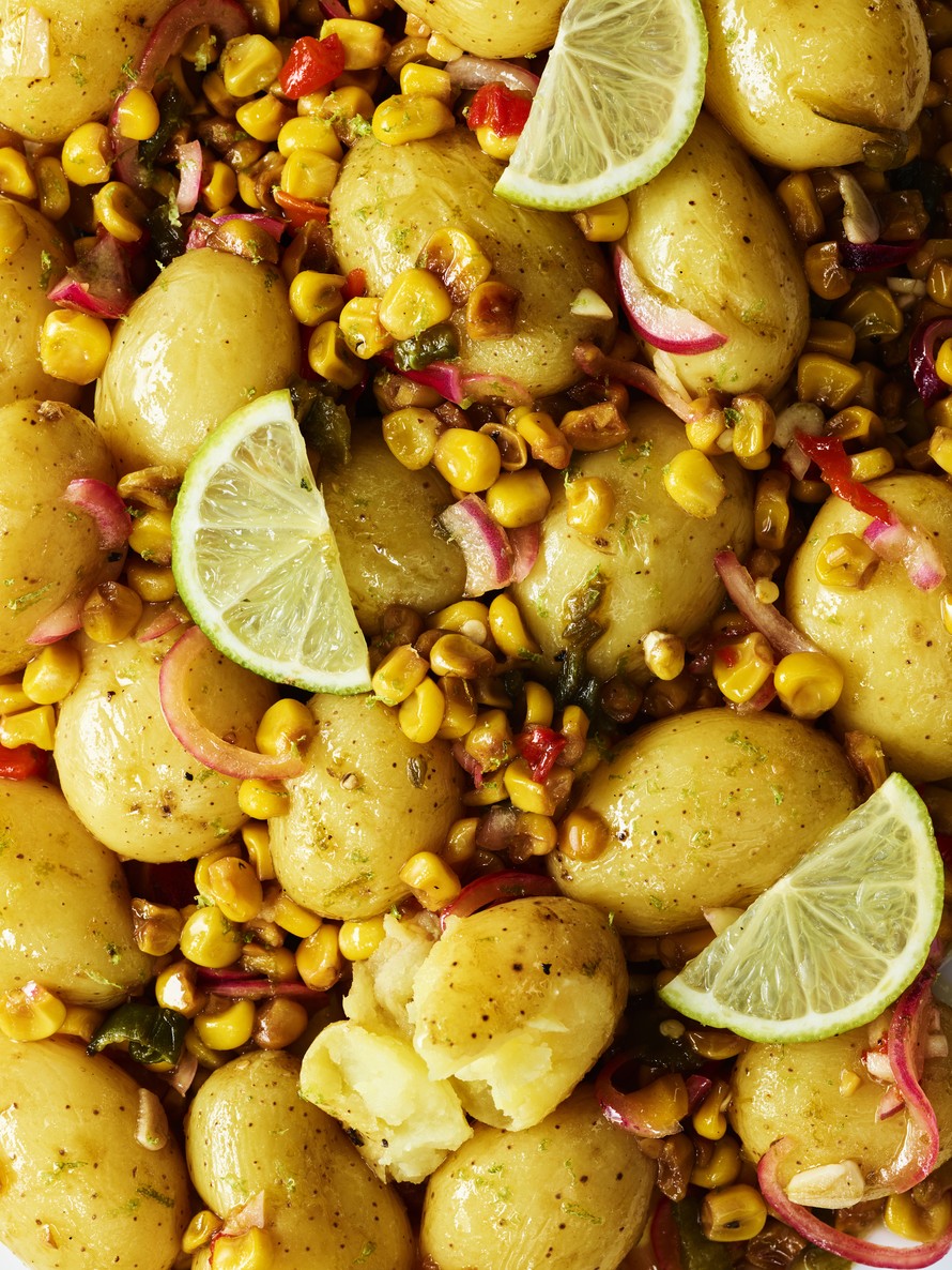 Pyörittele perunat limentäyteisellä kastikkeella, lisää joukkoon karamellisoidut maissit ja ihastu kirpeään peunasalaattiin!