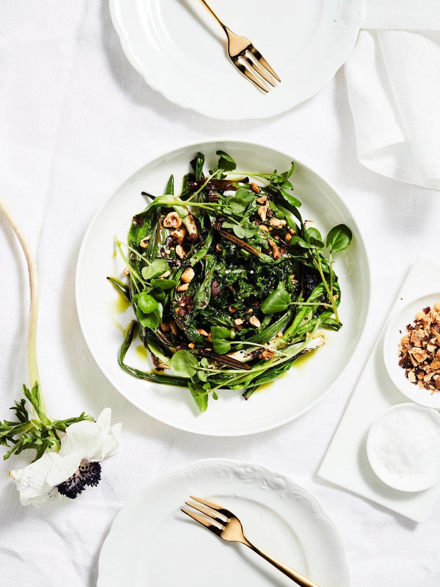 Jaa lehtikaali keoiksi lautasten keskelle ja asettele paahdetut kevätsipulit sen ympärille. Ripottele pähkinät ja rouhi pippuria annoksiin. Koristele vesikrassilla.