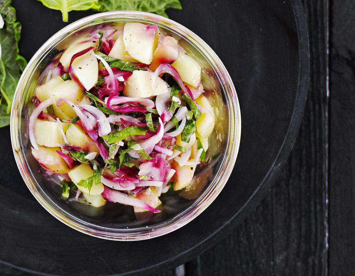 Shiso antaa perunasalaatille vinkeän maun. Voit kokeilla myös rucolaa.
