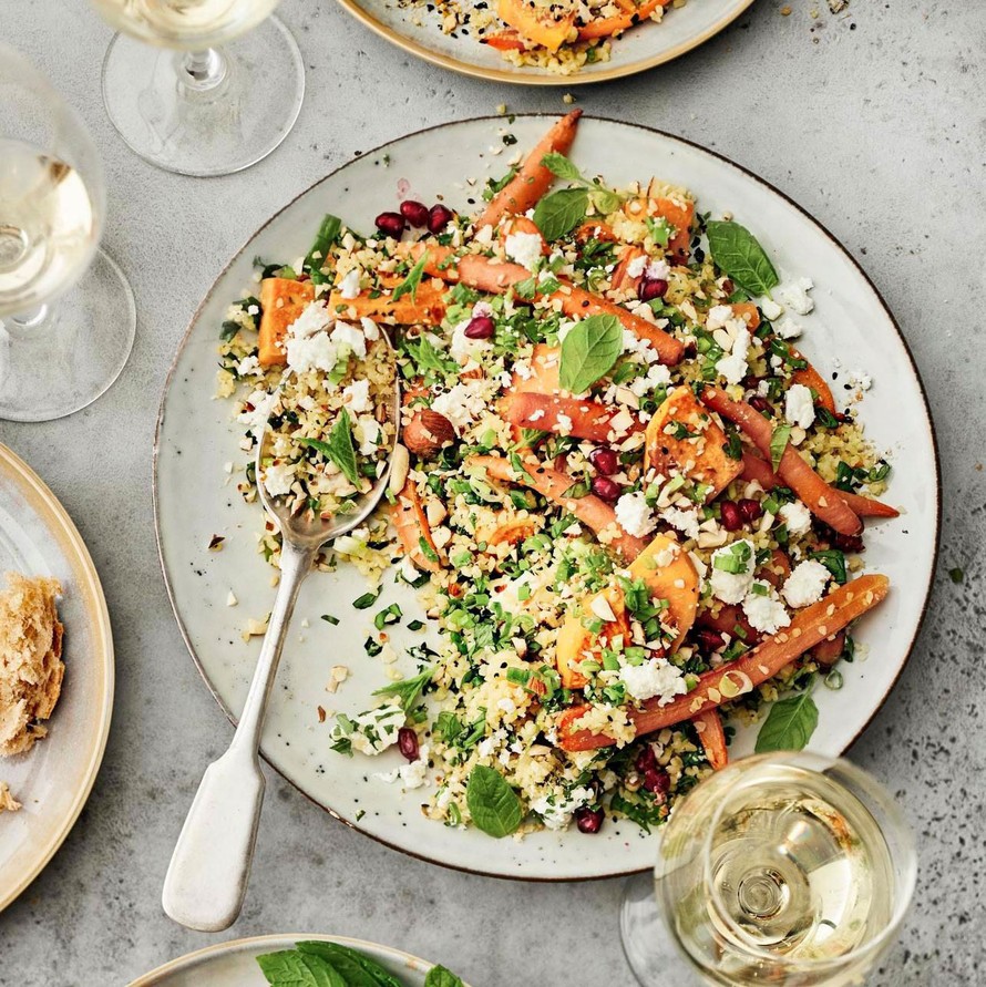 Bulgursalaatissa makeiksi paahtuneet porkkanat ja bataatit yhdistetään suolaiseen fetaan. Mausteeksi appelsiinin kuorta ja mehua ja tuoreita yrttejä, viimeinen silaus manteleilla ja granaattiomenan siemenillä. Täydellistä!