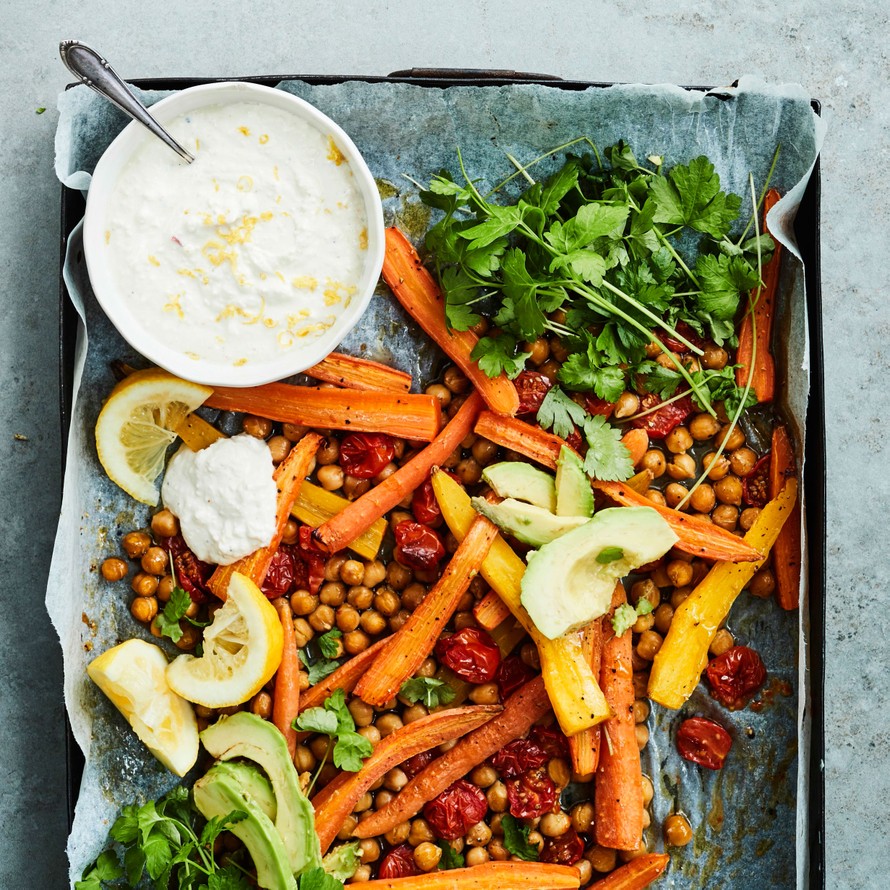 Salaatin ei tarvitse sisältää vihersalaattia eikä sen tarvitse olla kylmä. Paahdetuista kasviksista kootun salaatin proteiinilähteenä ovat rapeat kikherneet ja se tarjoillaan jogurttipohjaisen fetadipin kanssa.