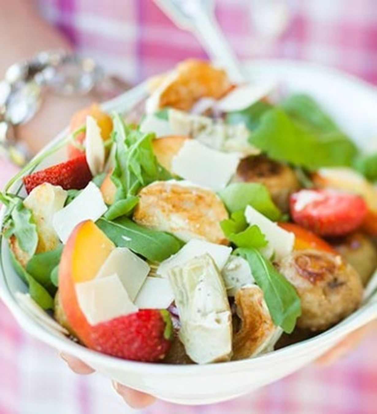 - Halkaise persikat ja poista kivet. Leikkaa hedelmät lohkoiksi ja grillaa nopeasti kauniin ruskeiksi. Silppua sipuli. Valuta ja halkaise aurinkokuivatut tomaatit, artisokansydämet ja mansikat.