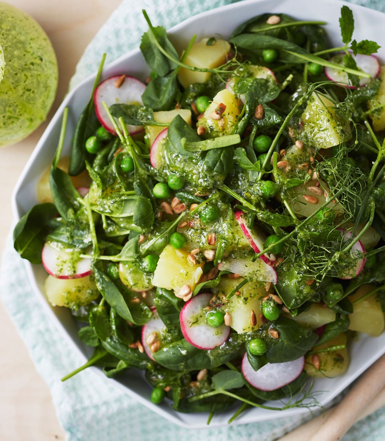 Vehreän perunasalaatin maun salaisuus on sitruunainen minttu-parmesaanikastike.