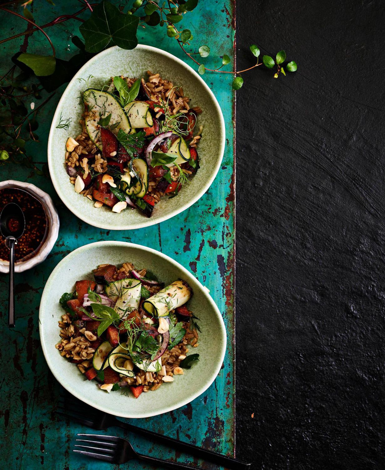 Ihana sadonkorjuusalaatti saa mehevyytensä luumuista ja kesäkurpitsoista. Ateriajyvät tekevät salaatista ruokaisan.