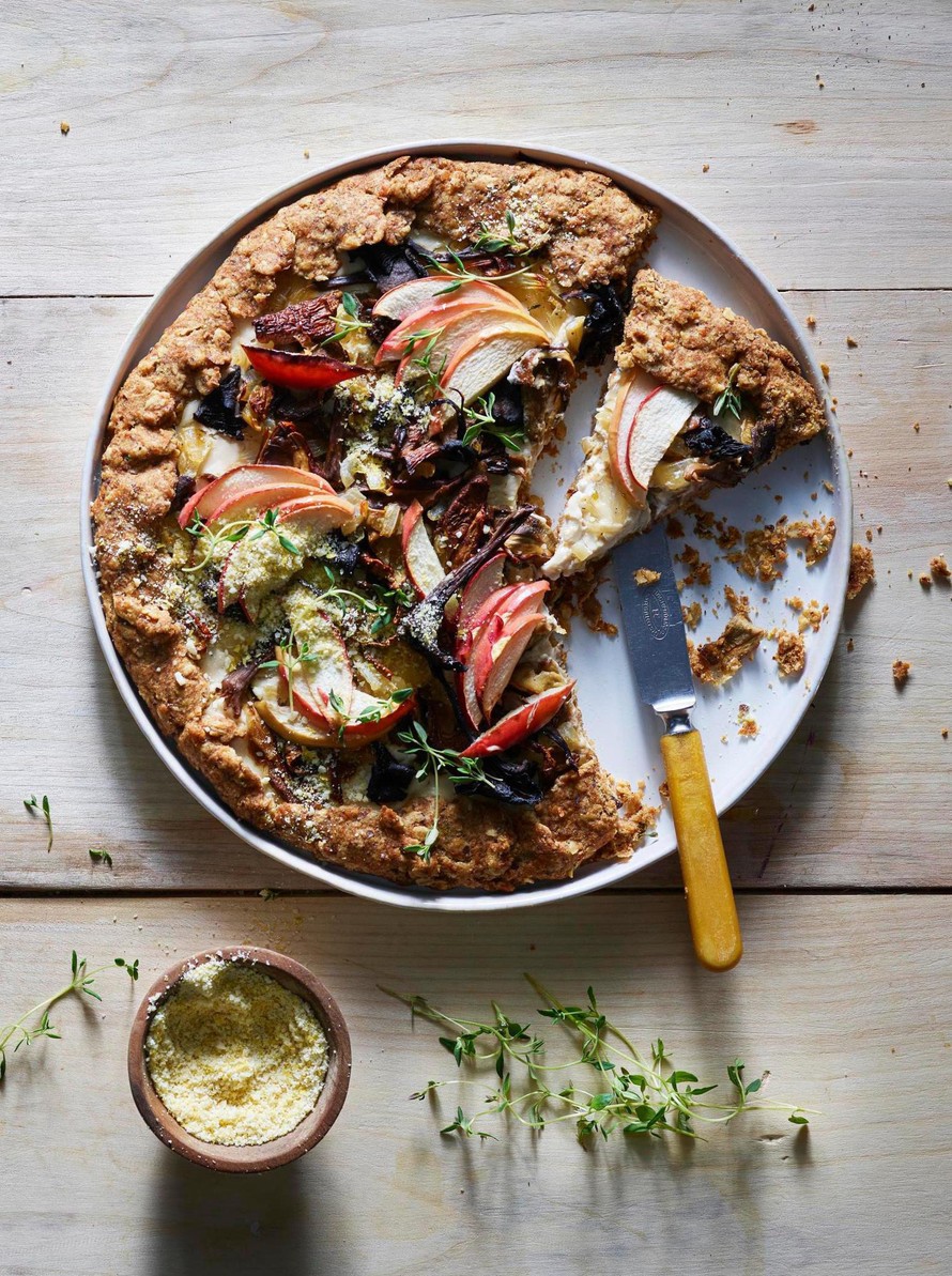 Laita uuni kuumenemaan 200 asteeseen. Kauli taikina leivinpaperin päälle pyöreäksi levyksi (halk. n. 30 cm). Levitä tuorejuusto levylle, niin että reunoista jää tyhjää noin 2–3 cm. Levitä sieni-sipuliseos ja omenaviipaleet juuston päälle. Taita galetten tyhjät reunat varovasti täytteiden päälle. Kypsennä uunissa noin 20 minuuttia.