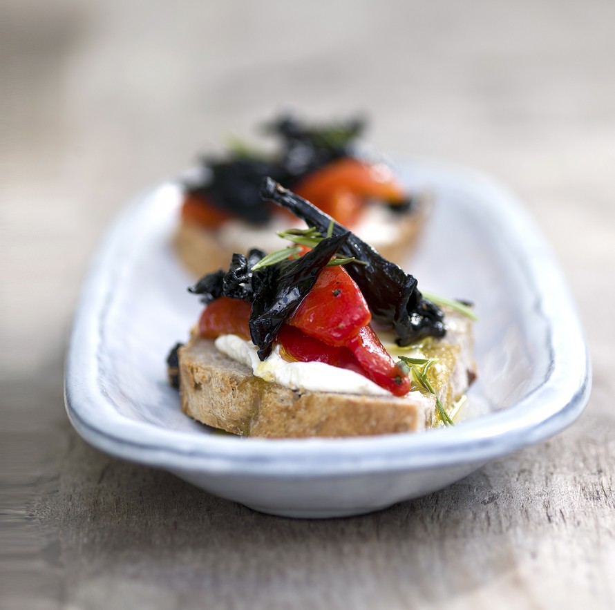 - Paahda leipäviipaleet uunissa tai paahtimessa. Sipaise leivän pintaan kevyesti oliiviöljyä ja maustamatonta tuorejuustoa. Levitä pinnalle paprikat ja sienet.