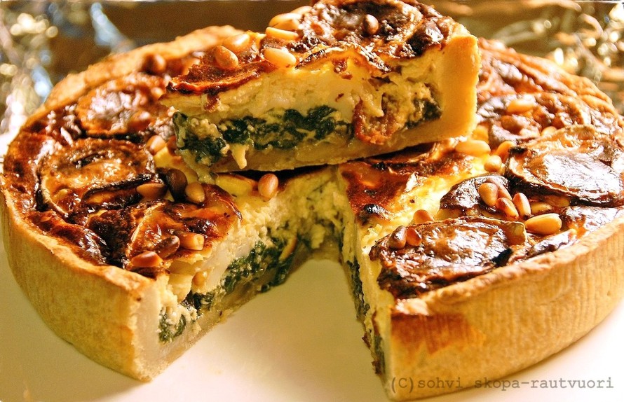 Lämmitä uuni 200 asteeseen. Kuullota pannulla öljyssä kuutioidut sipulit ja murskattu valkosipuli pehmeiksi. Lisää pilkotut pinaatit ja sekoittele kunnes suurin osa nesteestä on haihtunut. Mausta ja anna jäähtyä. Vatkaa munat kevyesti ja lisää sekaan kermaviili, kerma, aurinkokuivatut tomaatit ja raastettu parmesaani. Mausta suolalla ja pippurilla.