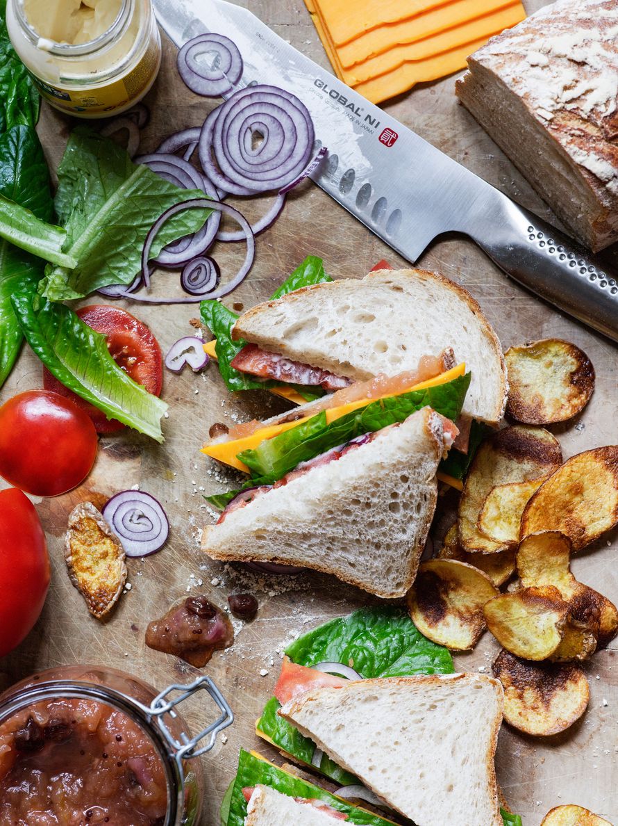 - Kokoa täytteet chutneyn päälle seuraavassa järjestyksessä: cheddar, salaatinlehti, tomaatti, sipuli ja majoneesileipä. Paina sandwich kasaan ja leikkaa kolmioiksi.