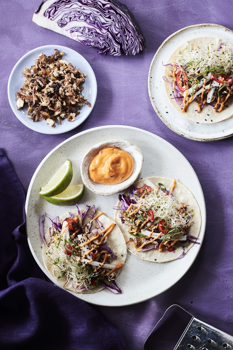 - Kasaa lämmitetylle tortillaletulle raastettua kaalia, tofua ja retikkaa. Viimeistele majoneesilla, iduilla, kevätsipulilla, chilillä ja seesaminsiemenillä. Purista päälle limetin mehua.