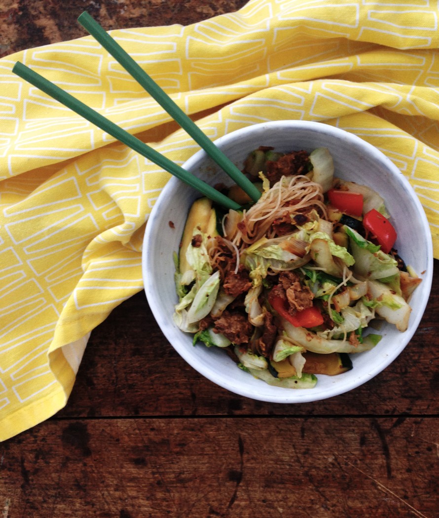 3. Kuumenna wokkipannussa öljy. Lisää chilikastike ja kesäkurpitsan, paprikan ja purjon palat. Paista kuumassa öljyssä noin 5 minuuttia. Lisää nyhtökaura ja jatka paistamista vielä muutama minuutti. Nostele pannulle kiinankaali ja nuudelit. Sekoita hyvin. Laita pannu pois päältä ja lisää soijakastike. Puolita lime ja purista mehu wokin päälle.