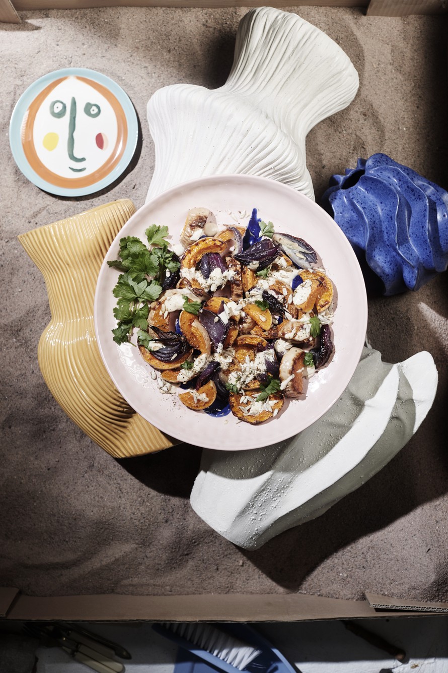 Pehmeät ja makeat kurpitsa ja sipuli saavat tarjoilulautasella päällensä pähkinäisen paahteisen, sitruunalla piristetyn tahini-kastikkeen sekä öljytilkassa paistettuja rapeita auringonkukansiemeniä. Makua ruokaan tuo myös zaatar-mausteseos, jossa on suolan lisäksi seesaminsiemeniä, timjamia, oreganoa ja sumakkia.