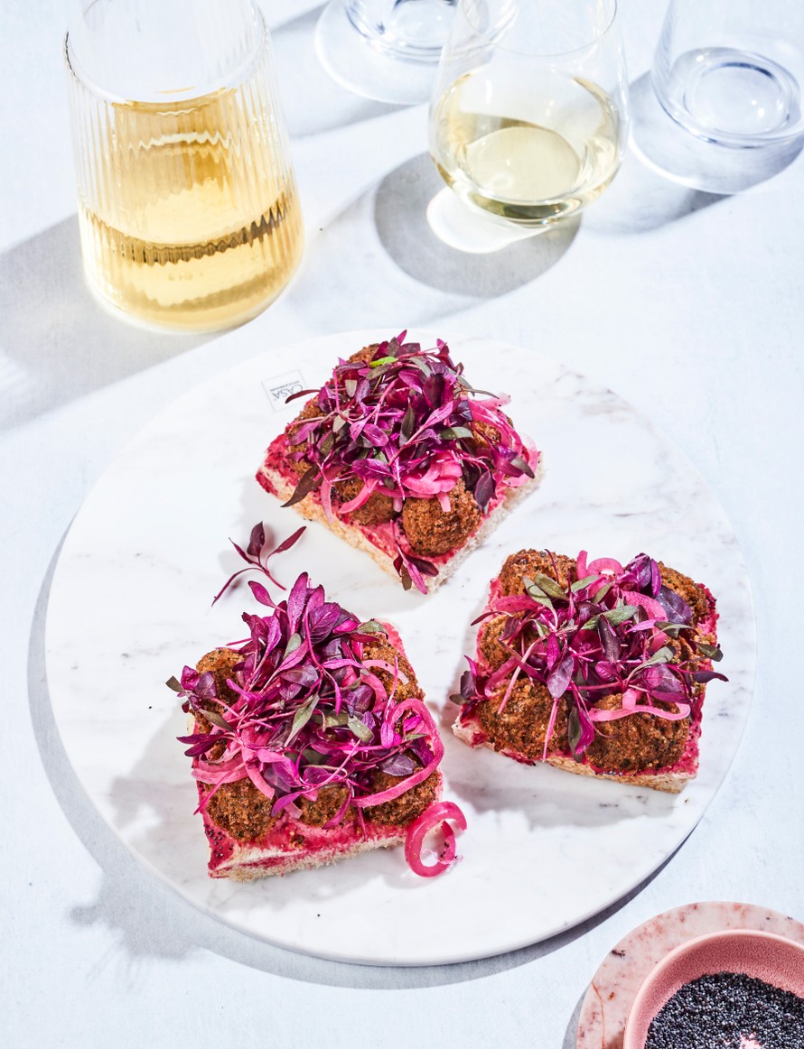 Täyteläinen vegaaninen punajuurihummus sopii täydellisesti tanskalaistyylisiin voileipiin! Lisää pikamarinoitua punasipulia ja rapeiksi paistettuja falafelpyöryköitä, niin saat tyylikkäistä leivistä hyvän hiukopalan.