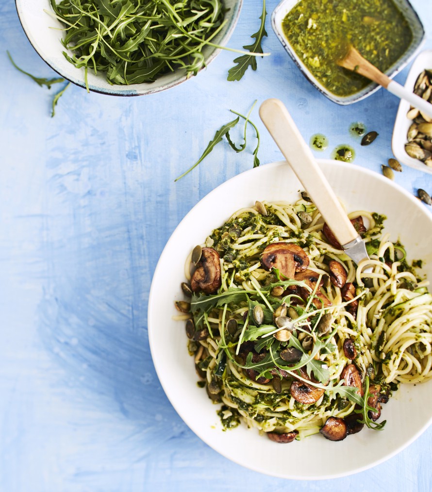 Vegaaninen pestopasta vie kielen! Salaisuutena on itse tehty pesto, jossa maistuvat rucola ja sitruuna. Balsamicosienet ja spagetin joukossa kypsyvät kesäkurpitsasuikaleet pitävät huolen mehevyydestä. Kokeile ja ihastu!