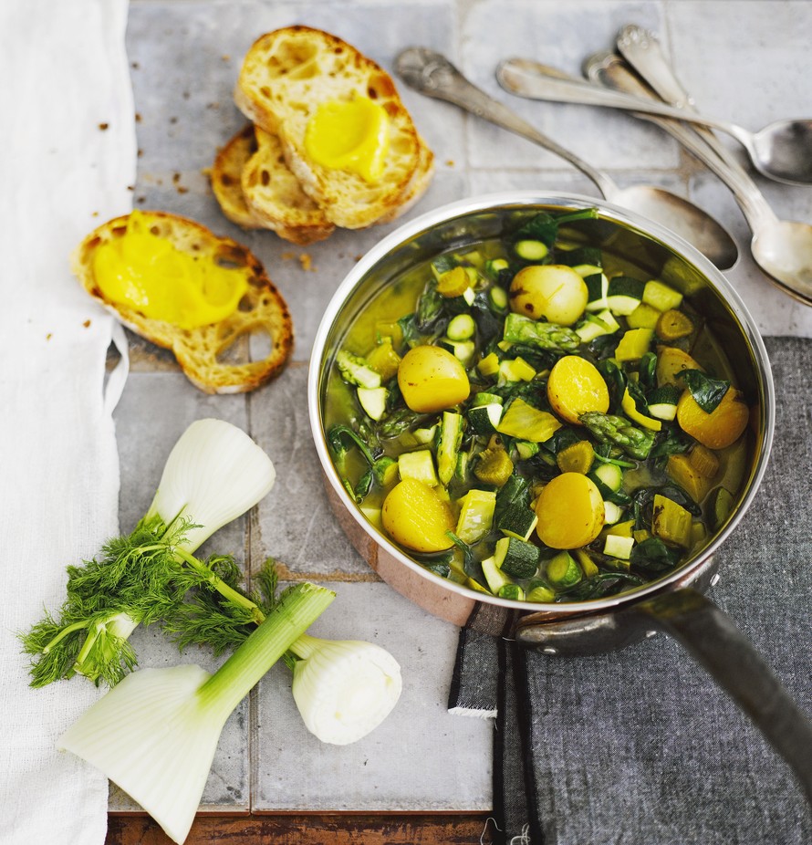 Klassinen Marseille’n keitto tehdään kourallisesta eri mareneläviä. Kasvisversio keitetään maan antimista: parsasta, purjosta, fenkolista, pinaatista ja varsiselleristä. Valkosipulinen aioli maistuu myös leivällä.
