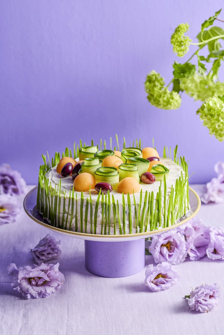 - Koristele kakku. Leikkaa vehnänoraat kakkua korkeammiksi ja painele niitä reunoille. Vuole juustohöylällä kurkusta pitkiä viipaleita ja kierrä ne rullalle. Koverra melonista palleroita. Aseta kakulle kurkkurullia, melonipalloja ja oliiveja.