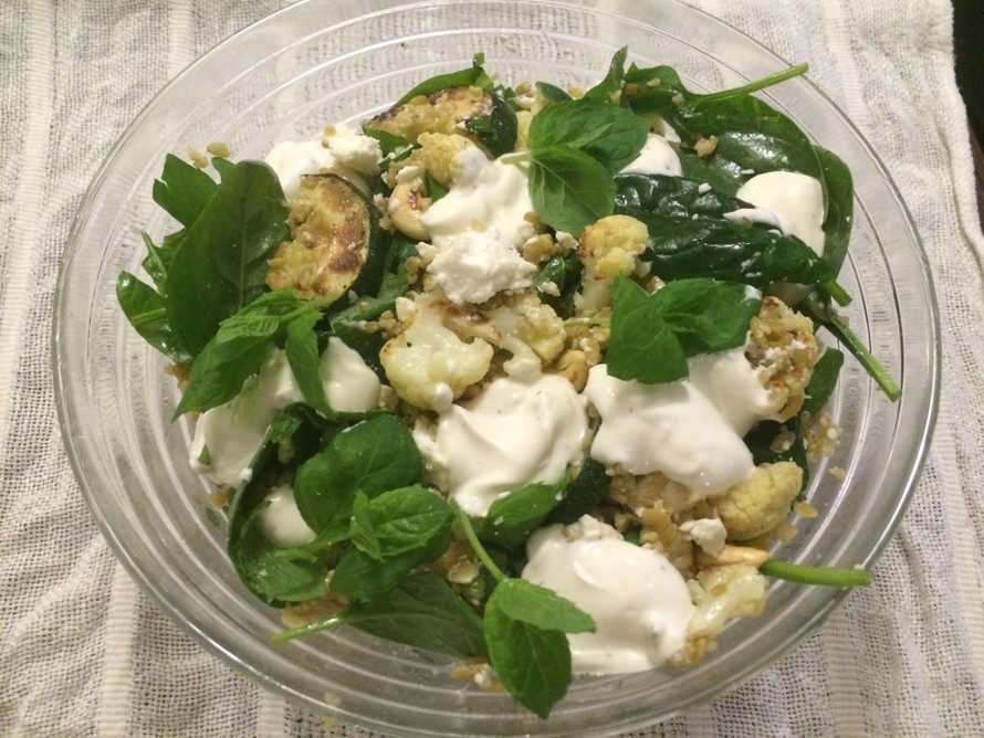 - Sekoita kulhossa kypsä freekeh, kukkakaalinnuput, kesäkurpitsaviipaleet, pähkinät, murustettu feta sekä mintun ja pinaatin lehdet. Ripota salaattiin hieman suolaa ja rouhaise mustapippuria. Tarjoa jogurttikastikkeen kera.