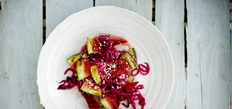 Kuumana kesäpäivänä grillataan vesimelonia salaattiin. Melonin lisäksi tarvitaan vain ricottaa, punasipulia ja loraus balsamicokastiketta