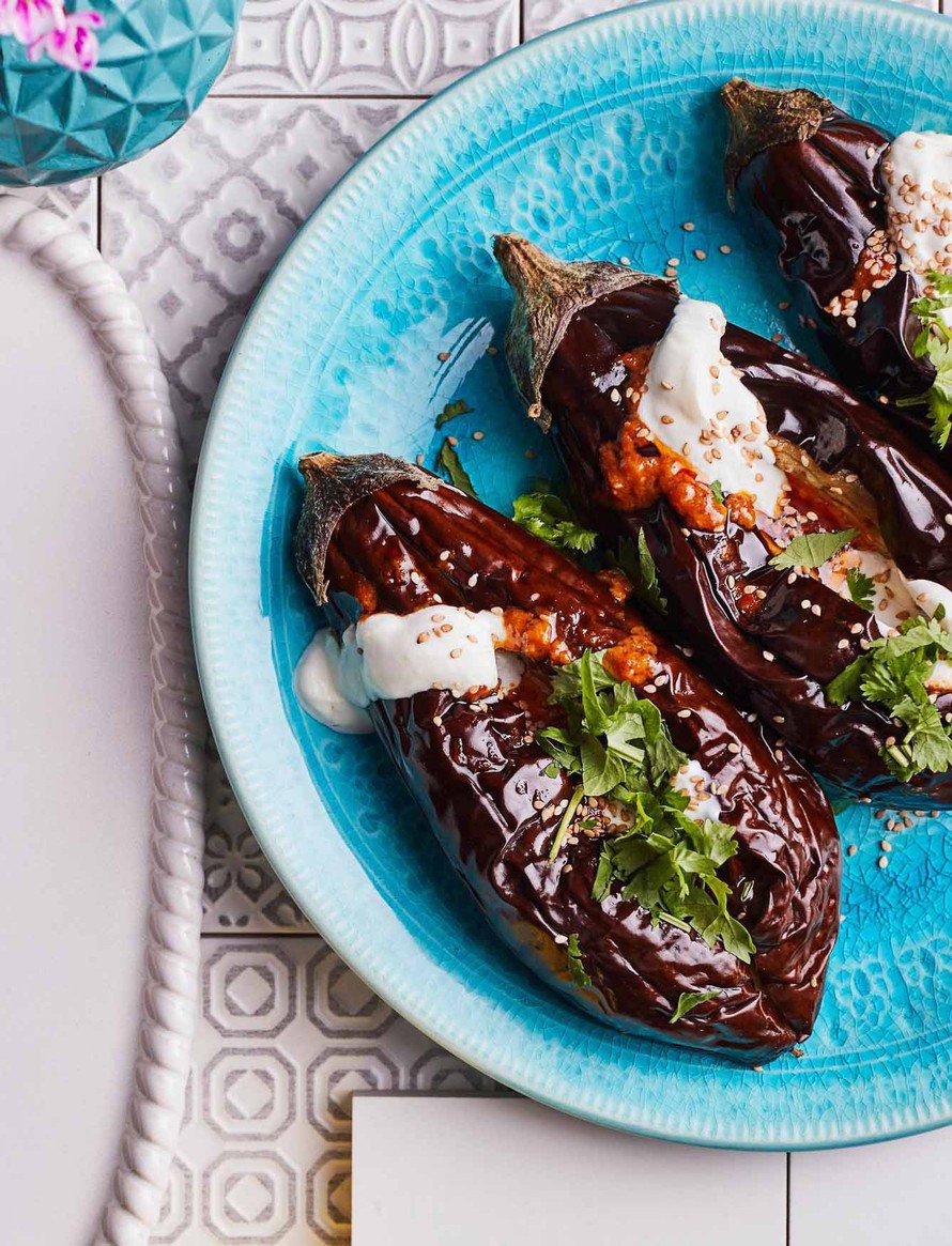 Pistele veitsen kärjellä munakoisoihin reikiä. Valele öljyllä ja nosta leivinpaperin päälle uunipellille. Paahda noin 40 minuuttia, kunnes munakoisot ovat läpipaahtuneita ja pehmeitä.