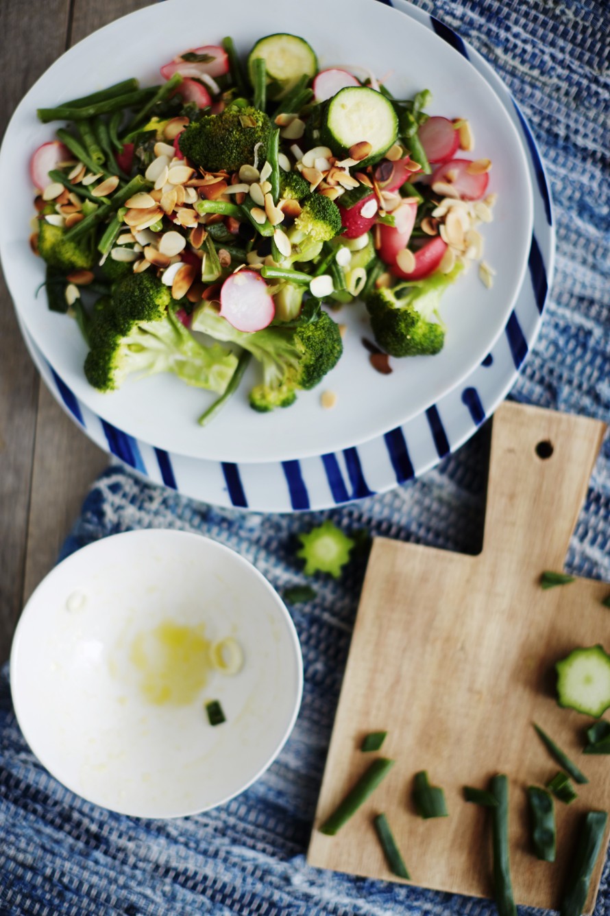 4. Nosta vihannekset tarjoiluastiaan, kaada päälle kastike ja sekoita. Viimeistele mantelilastuilla.